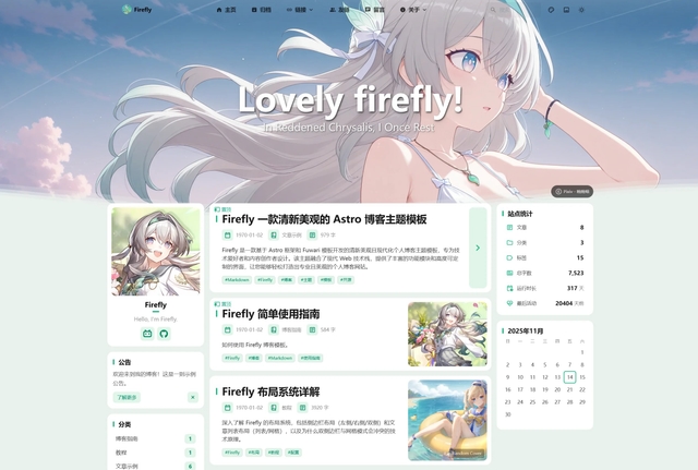 Firefly is a fresh and visually appealing Astro blog theme template,Secondary development based on Fuwari, featuring the lovely Firefly from Honkai: Star Rail as its mascot!