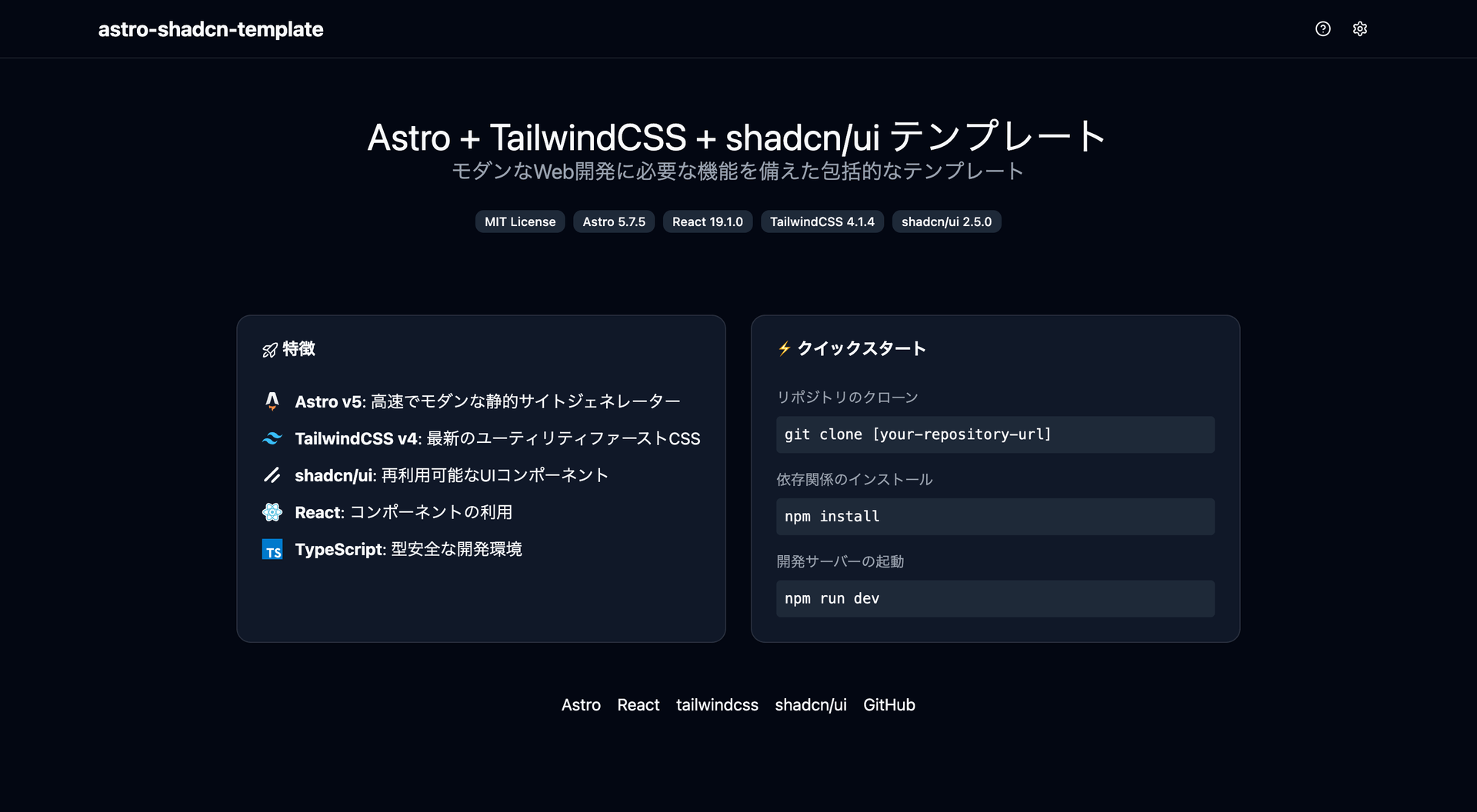 This template integrates shadcn/ui, providing a modern, reusable UI component system. shadcn/ui is a collection of beautiful, accessible, and customizable components.