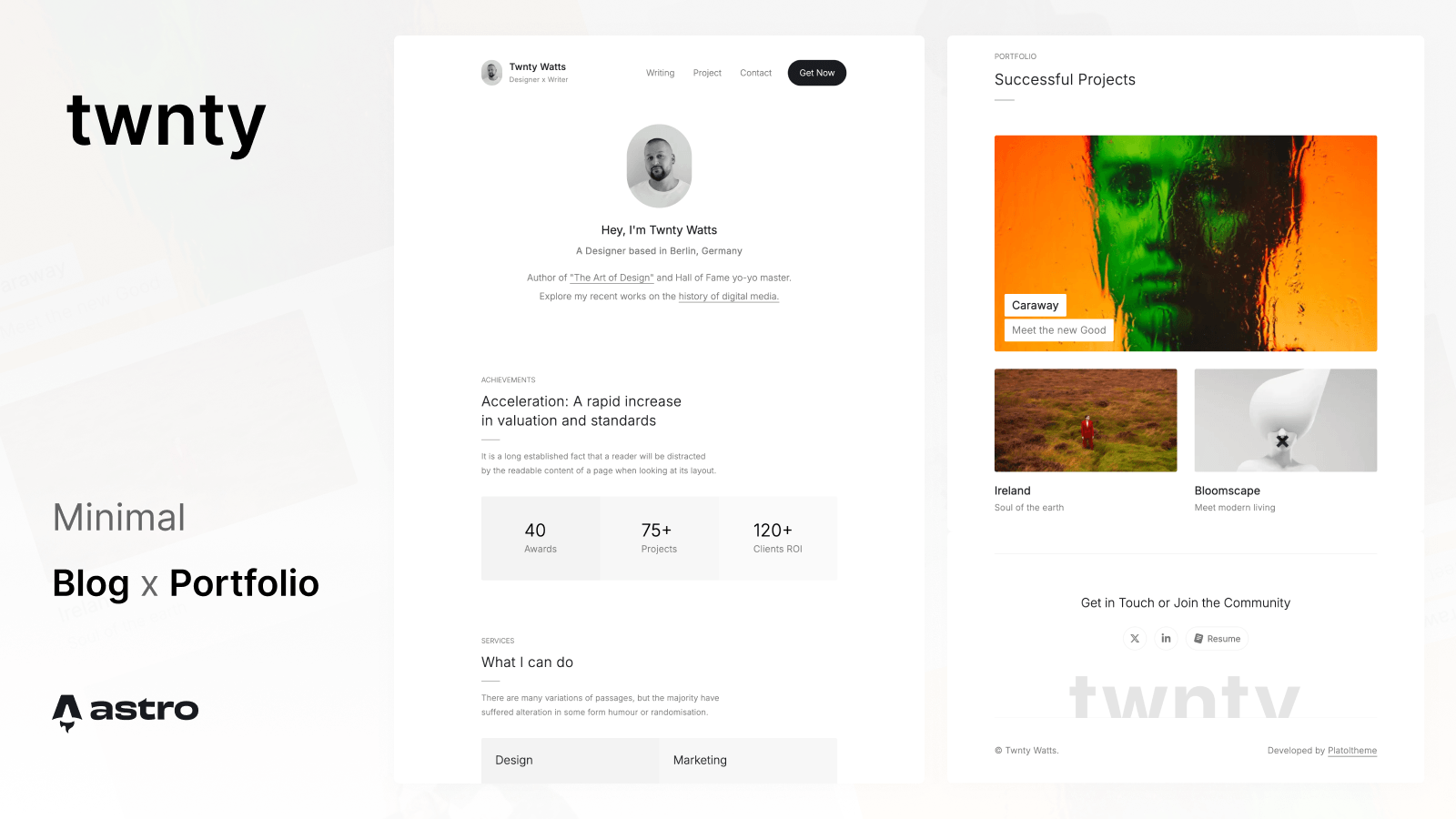 Twnty is a sleek Astro theme designed for professionals to showcase their resume, CV, portfolio, and blog. Fully responsive, SEO-friendly, and easy to customize, Twnty helps you create a standout online presence and share your work with the world.