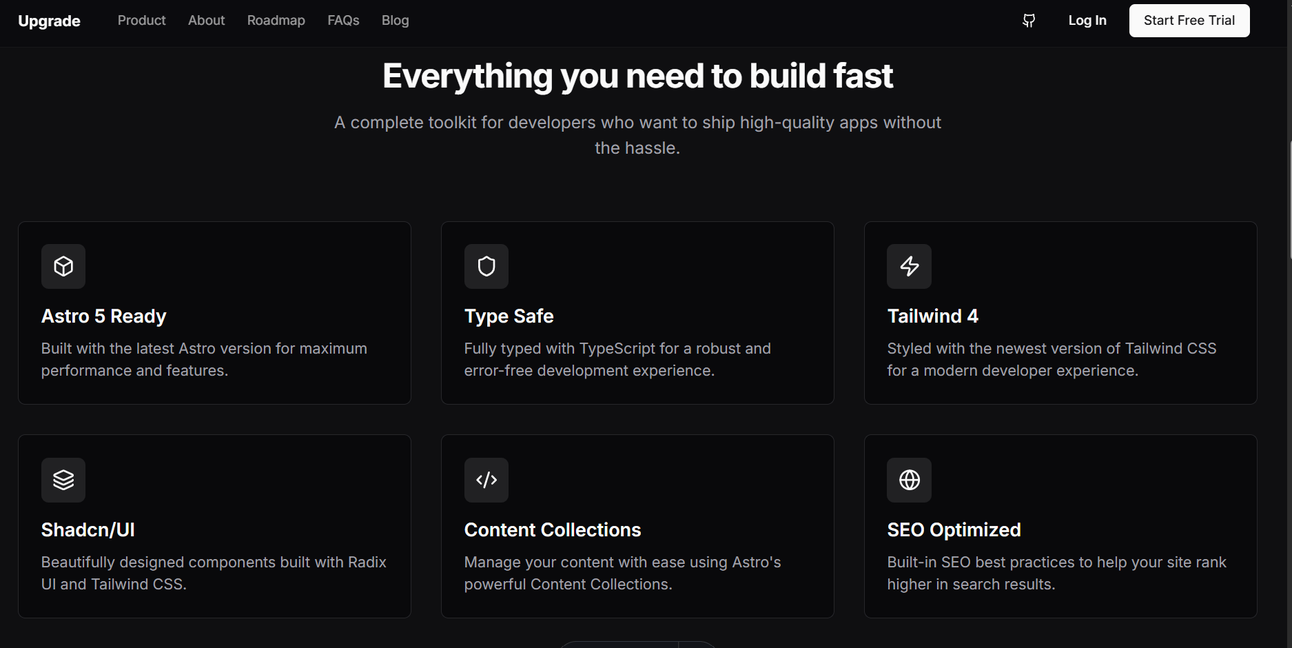 Upgrade is a high-performance, developer-focused landing page template built with the latest web technologies: Astro 5, Tailwind CSS and React.
