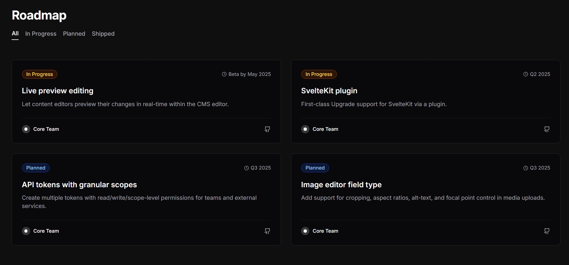 4. Roadmap: Timeline of features (In Progress, Planned, Shipped).